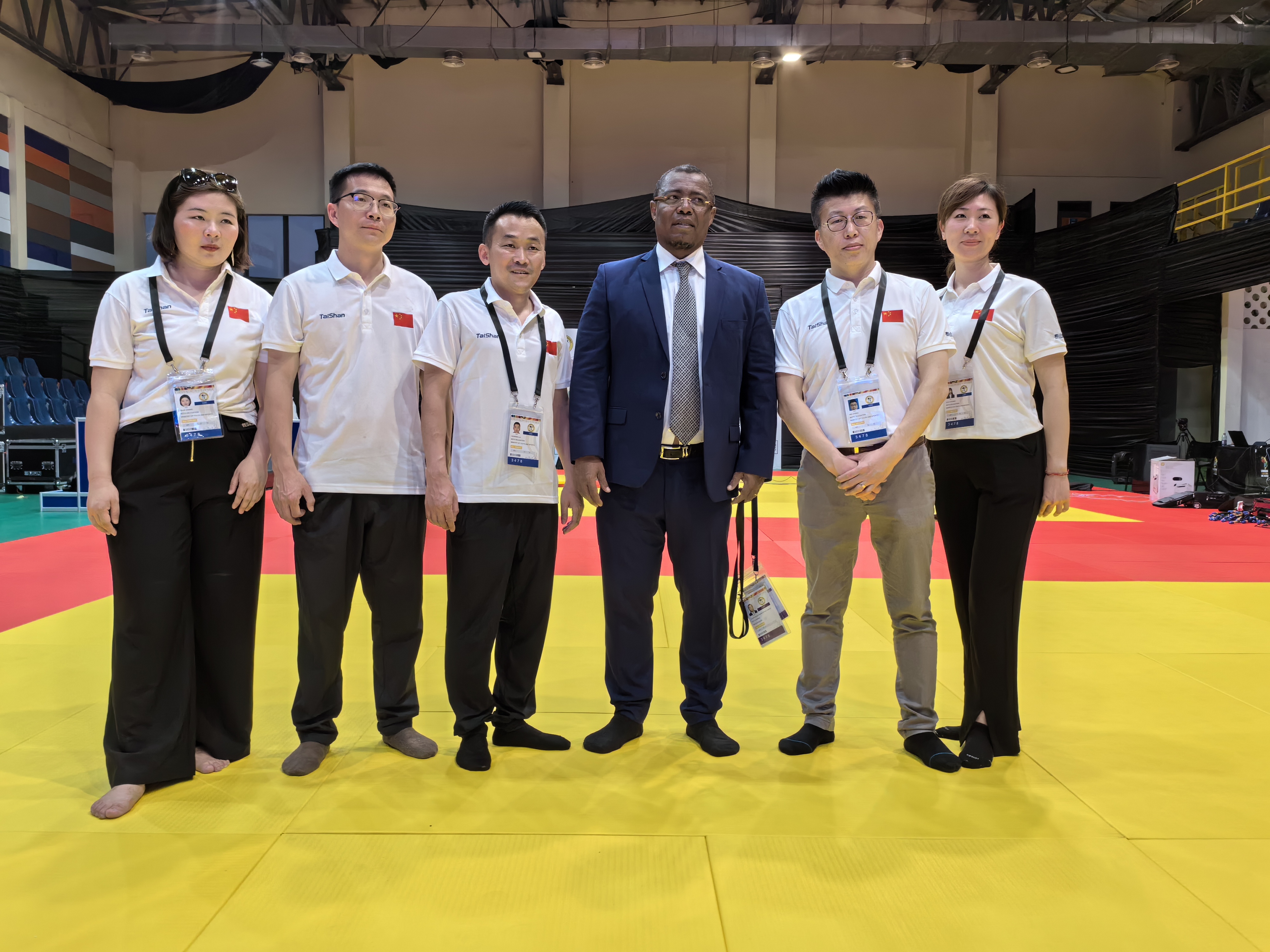 △ pt古怪猴子体育保障团队与非洲柔道联盟主席Siteny Randrianasolo合影