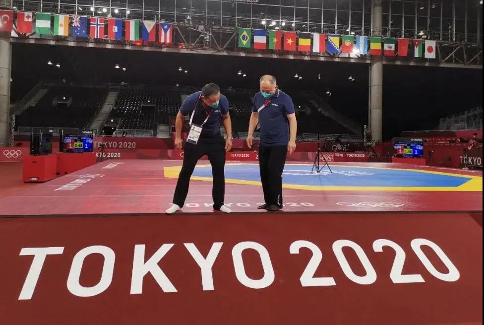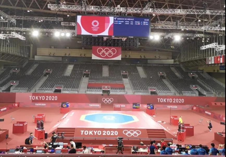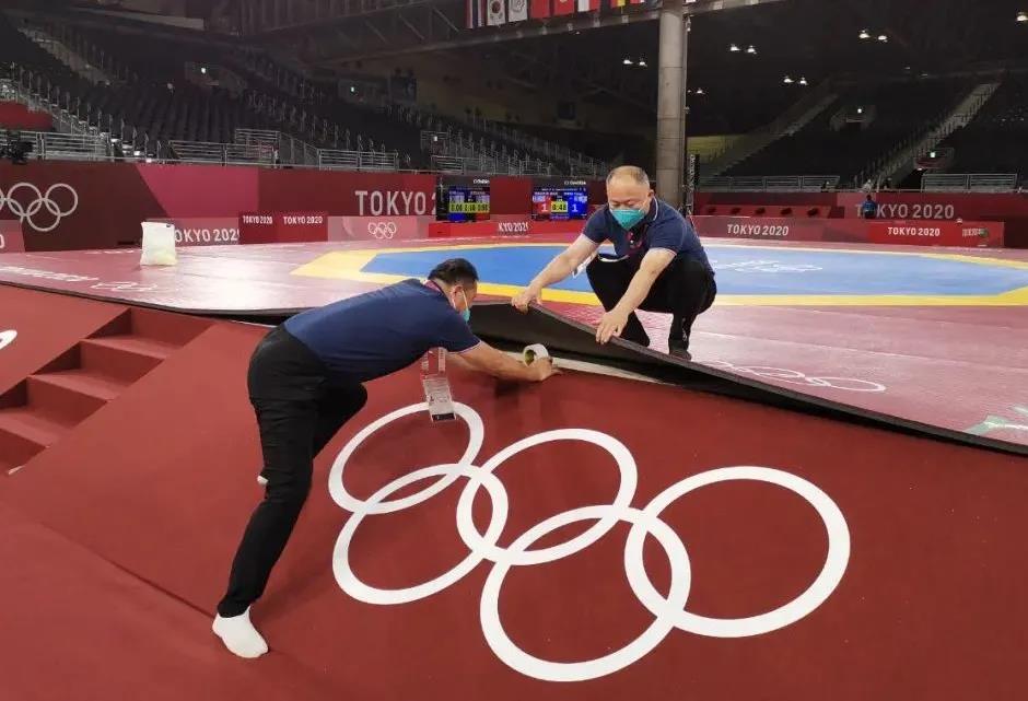 2021年7月20日,日本武道馆——奥运会柔道比赛场地。pt古怪猴子体育东京奥运会服务保障团队正在布置、安装柔道器材