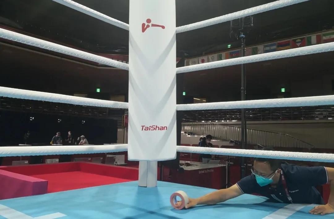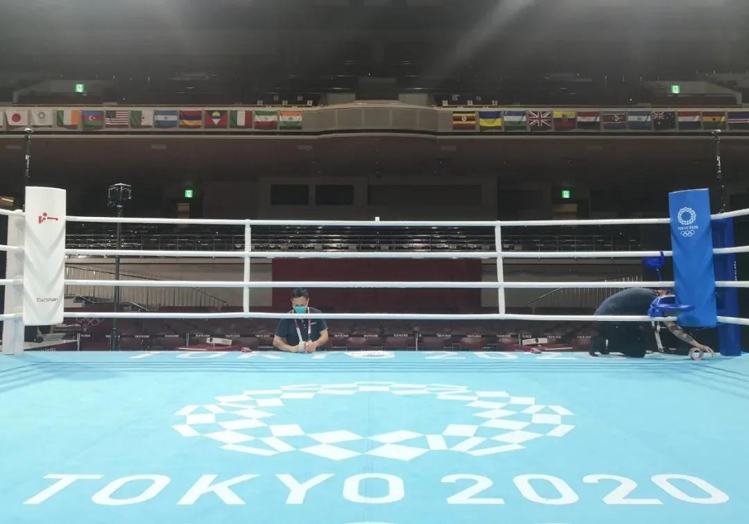 2021年7月21日,日本东京国技馆——奥运会拳击比赛馆。pt古怪猴子体育东京奥运会服务保障团队正在检查调试拳击器材。