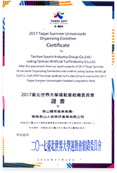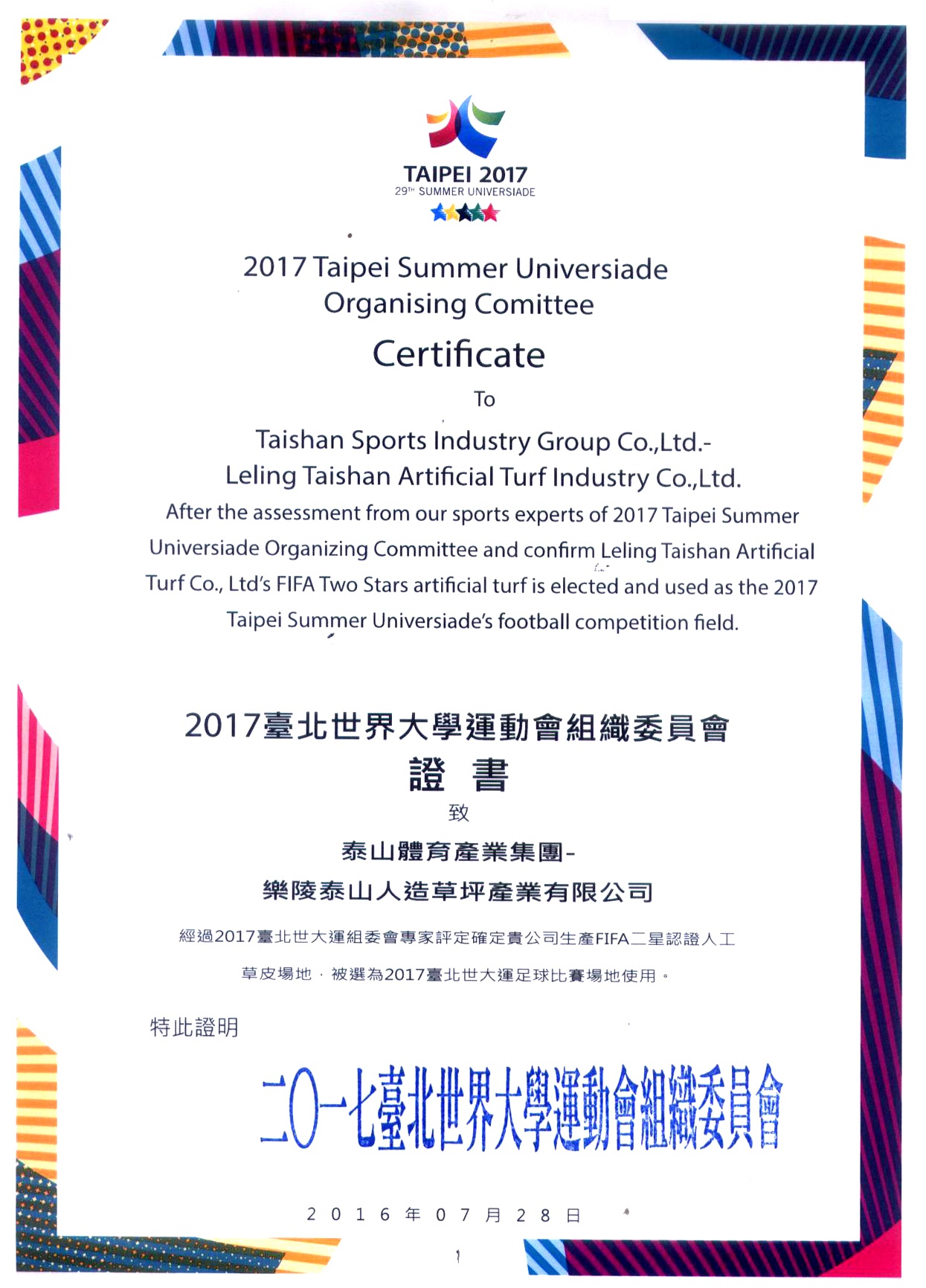 2017台北世界大学运动会组织委员会证书致乐陵pt古怪猴子人造草坪产业有限公司